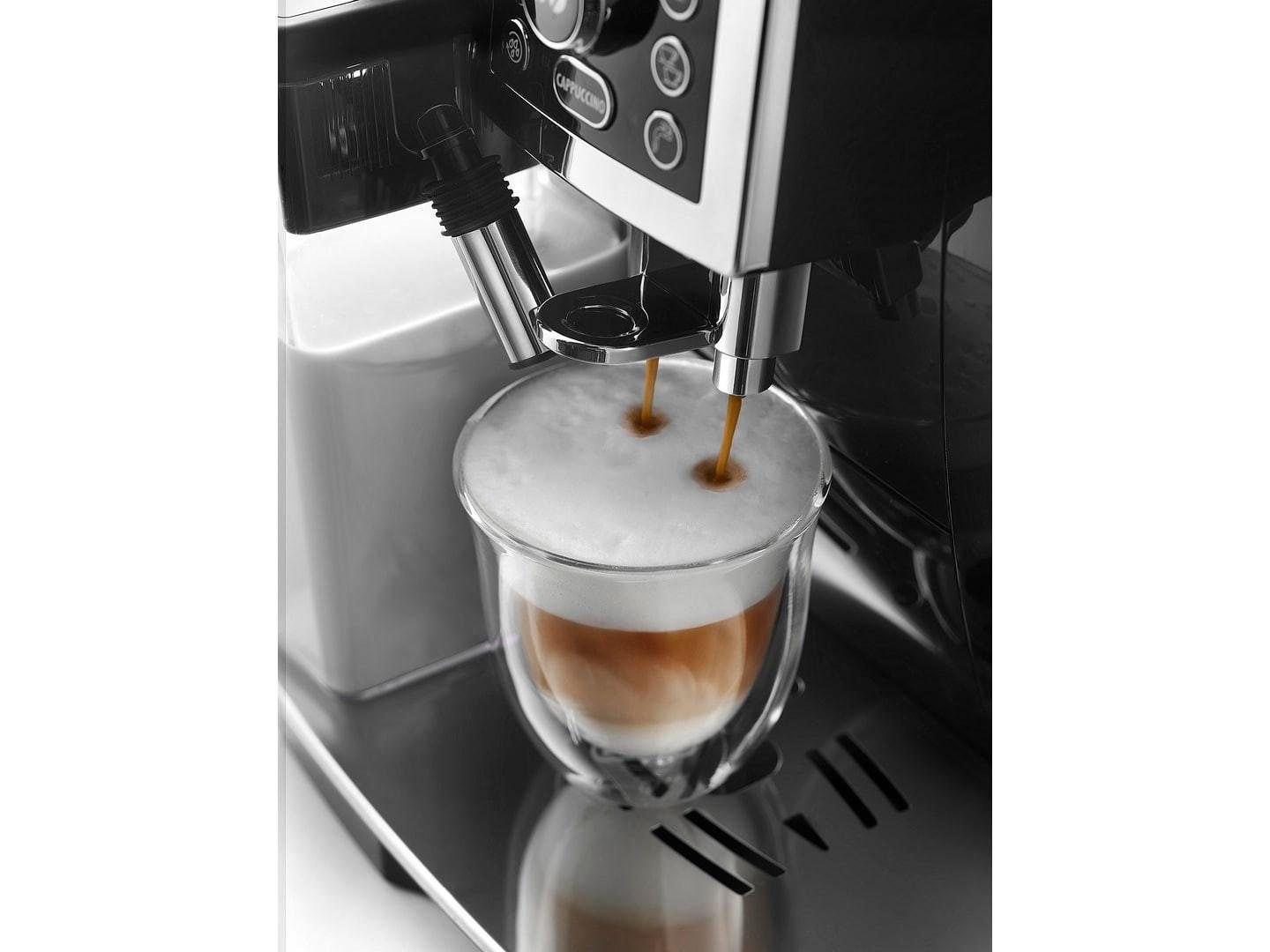 | Ausstattung | LatteCrema Milchaufschäumsystem Vario-Drehregler zur Einstellung der Milchschaumkonsistenz Herausnehmbare wartungsarme Brühgruppe Programmierbare automatische Abschaltung Vollautomatisches Spül- und automatisches Entkalkungsprogramm Beheizte Tassenabstellfläche Das Gerät kann sowohl mit Kaffeebohnen als auch mit Pulver betrieben werden |