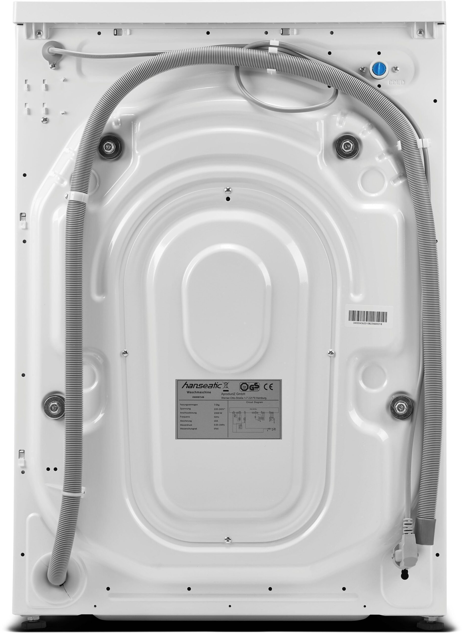 | Lieferumfang | Zulaufschlauch, 4× Abdeckkappen für Transportsicherungslöcher, Kurzanleitung, Garantiebeilage |