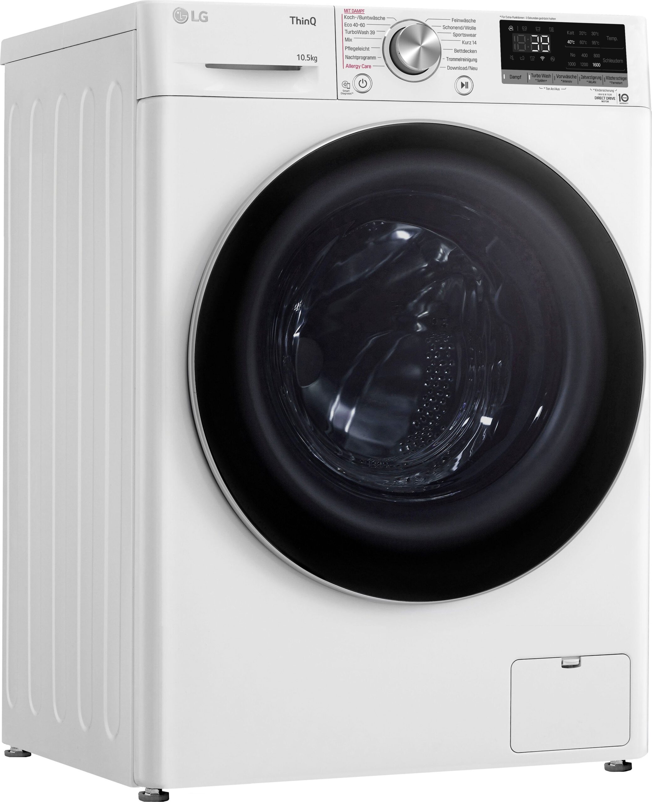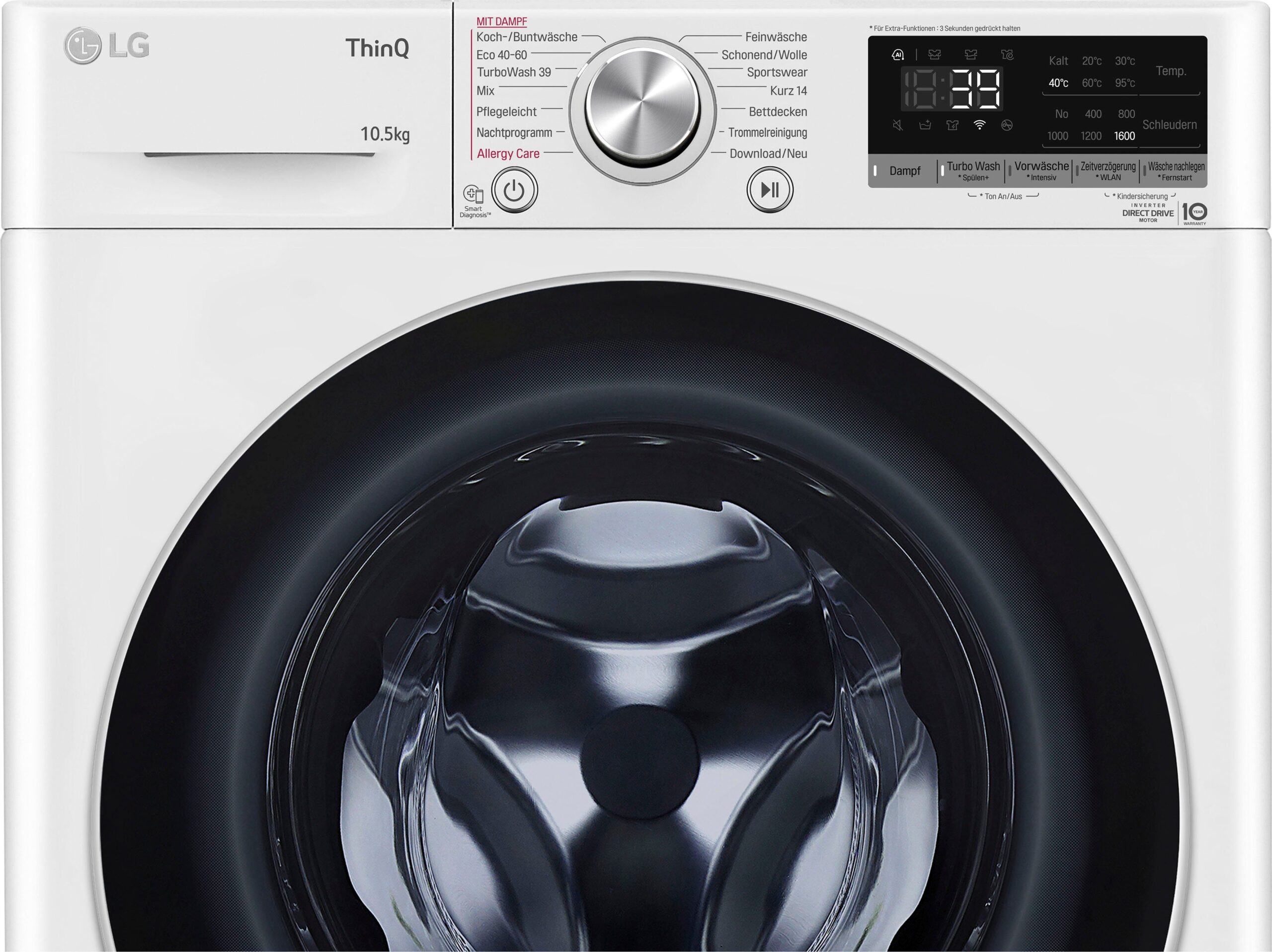 | Weitere Vorteile | AI DD: Intelligente Erkennung der Fasern für 18% mehr Gewebeschutz Edelstahl Mitnehmer: Hygienisch, Strapazierfähig und keine Verfärbungen Sicherheitsglastür: Stabil, Kratzfest, Hygienisch und Hitzebeständig Steam: Tiefenreinigung mit Dampf mit speziellem Programm wie AllergyCare ThinQ®: vernetzte Zukunft eingebaut TurboWash™ 360°: 4 Einsprühdüsenfür schnelleres und schonenderes Waschen in nur 39 min. (halbe Beladung) |