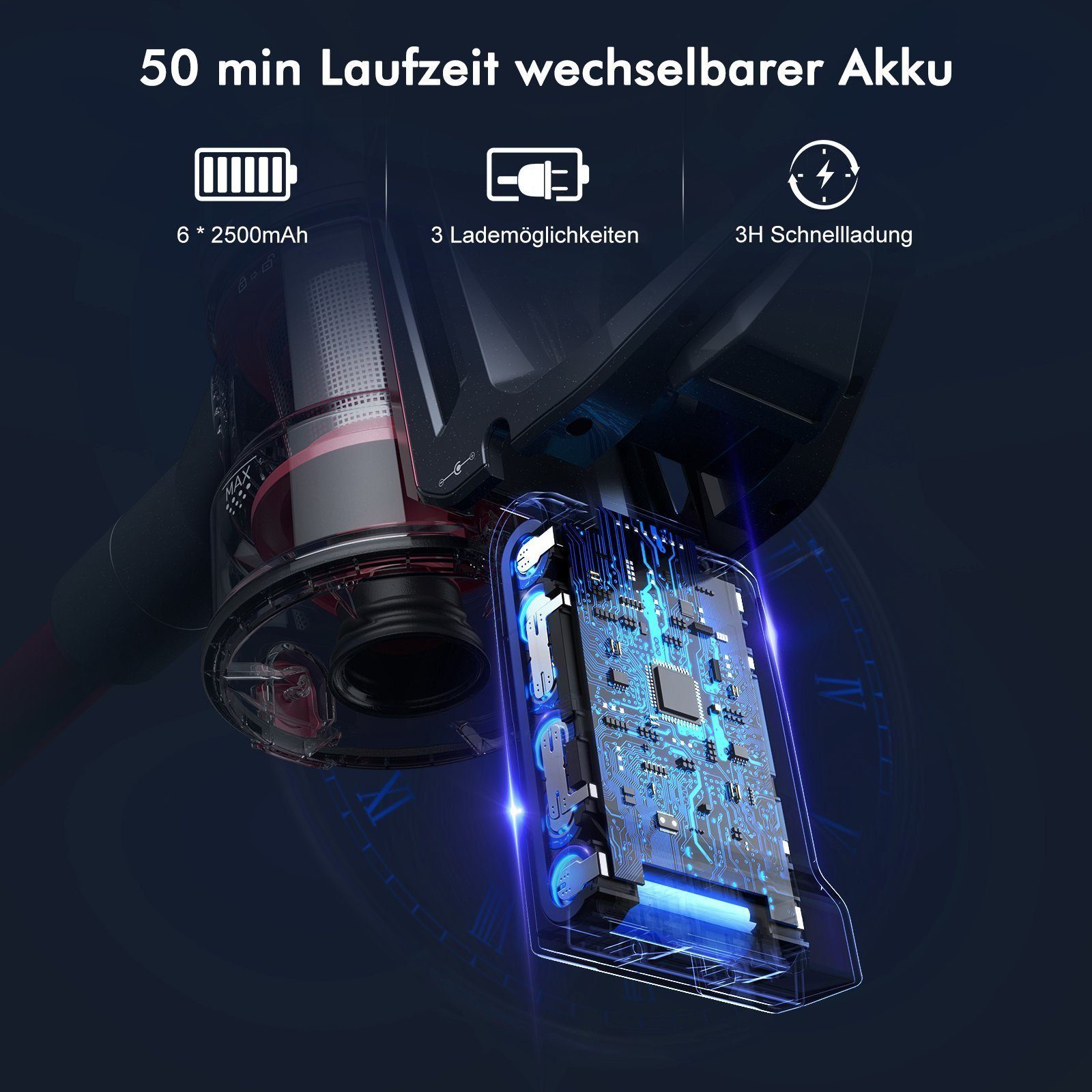 • Leistungsstarke abnehmbaren Akku mit Kapazität: Bis zu 50 Min. Reinigungsleistung dank 22,2V-6*2500mAh-Litium-Ionen-Akkus.Super Akkulaufzeit, saubere 150qm Haus.