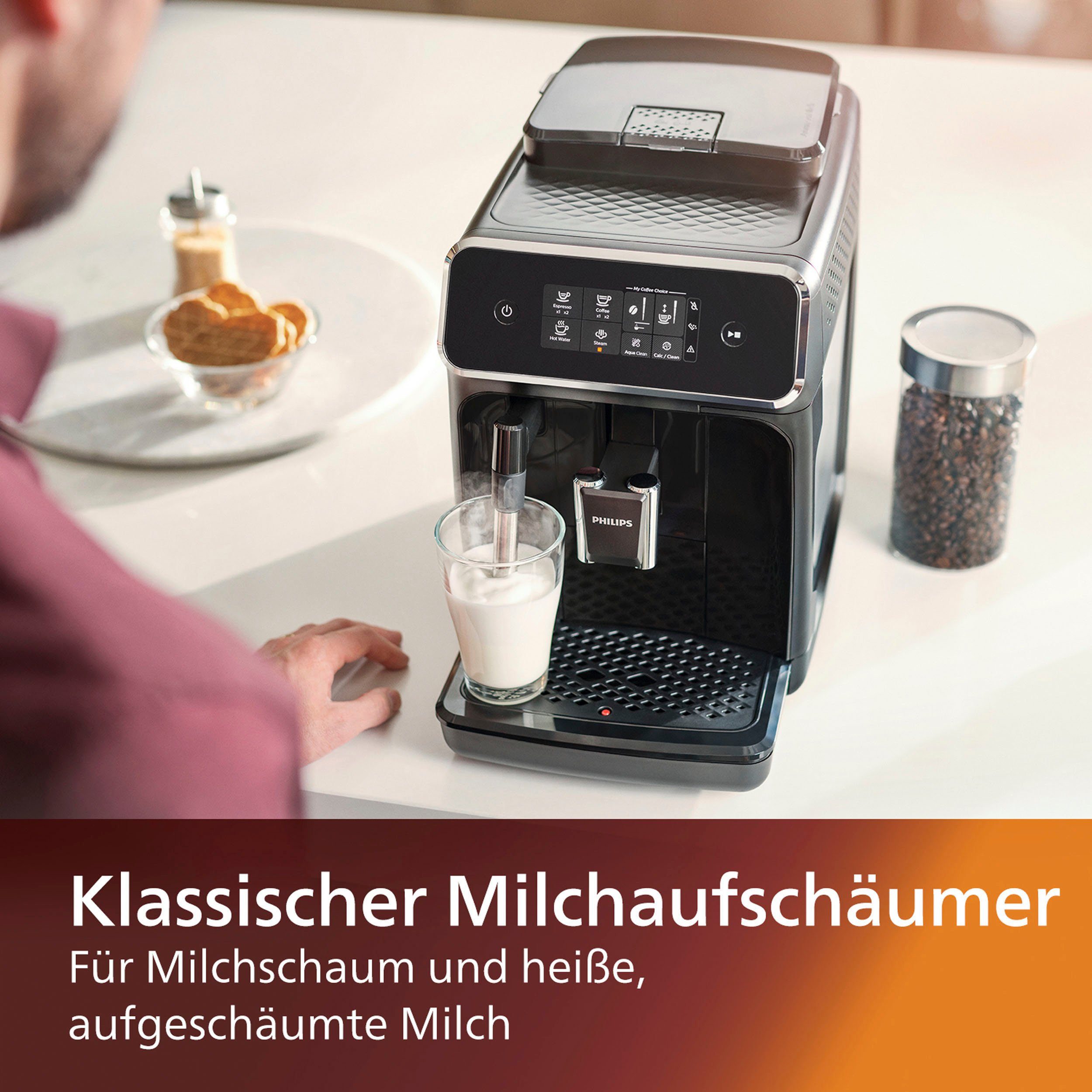| Weitere Vorteile | • 12-stufige Mahlwerkeinstellung: Unser langlebiges Keramikmahlwerk kann in 12 Schritten eingestellt werden, sodass Sie Ihre Bohnen in extrem feines Pulver oder grobe Stücke mahlen können. • Intuitive SensorTouch Oberfläche: Der unwiderstehliche Geschmack und das Aroma von Kaffee aus frischen Bohnen sind nur einen Tastendruck entfernt. Mit unserer intuitiven SensorTouch Oberfläche können Sie ganz einfach Ihren Lieblingskaffee auswählen. • Klassischer Milchaufschäumer: Der klassische Milchaufschäumer gibt Dampf aus, mit dem Sie ganz einfach seidig glatte Milchschaum für Ihren Cappuccino zubereiten können. Und außerdem? Der Milchaufschäumer ist mit nur zwei Teilen leicht zu reinigen. • Perfekt in Temperatur und Aroma: Das Aroma Extract System sorgt für ein optimales Gleichgewicht zwischen Brühtemperatur und Aromaentfaltung, indem die Wassertemperatur zwischen 90 °C und 98 °C gehalten und gleichzeitig die Wasserdurchflussrate reguliert wird, sodass Sie köstliche Kaffeesorten genießen können. • Scheibenmahlwerk aus 100 % Keramik: Unser Mahlwerk besteht zu 100 % aus Keramik: Es ist extrem hart und präzise, damit Sie frischen aromatischen Kaffee für mindestens 20.000 Tassen genießen können. |