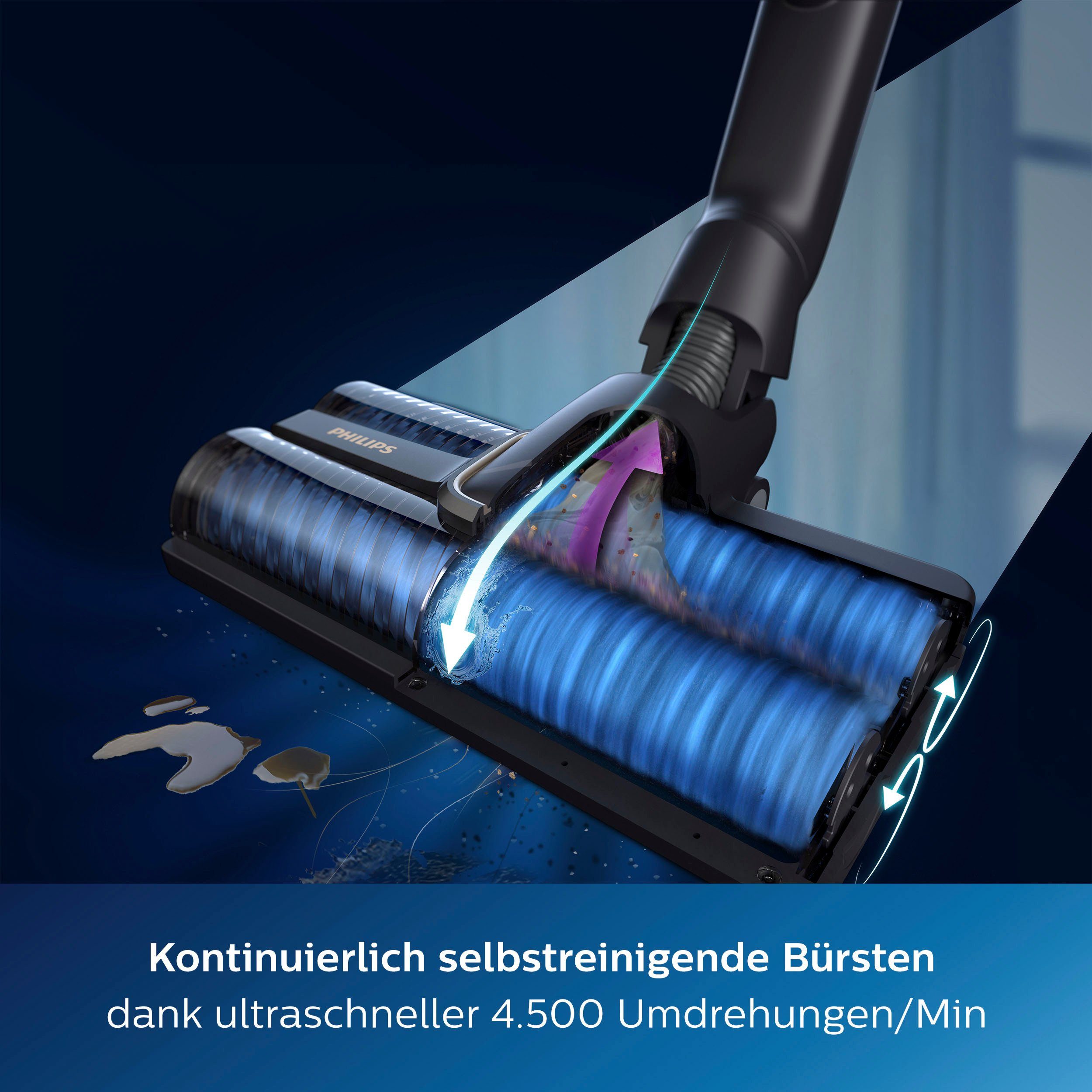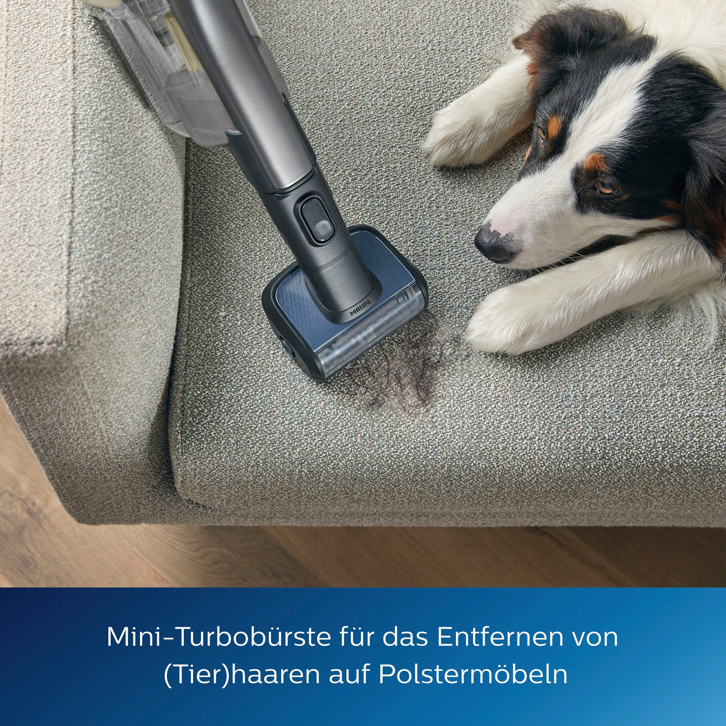 | Mitgeliefertes Zubehör | Reinigungs- und Aufbewahrungsstation, Mini-Turbo-Saugbürste, Lange Fugendüse, Reinigungsbürste, Wandhalterung, AquaSpin-Düse, LED-Düse. Bedienungsanleitung |