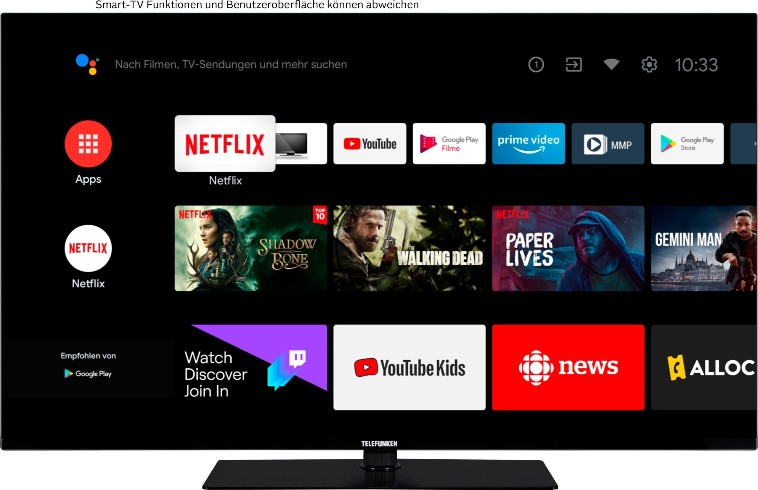 | Verfügbare Apps | Amazon Prime Video Google Play Movies Google Play Store Media Share 2.0 Netflix YouTube |